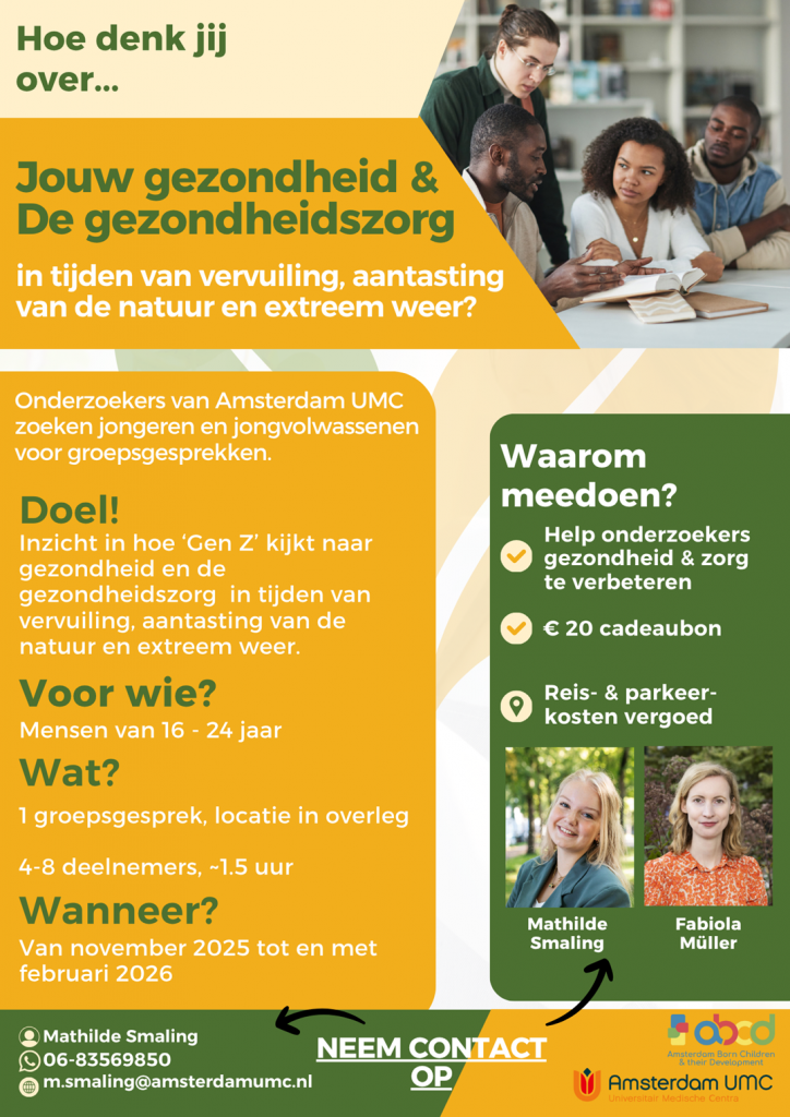 Het project wordt uitgevoerd door Dr. Fabiola Müller (Amsterdam UMC, afdeling Public & Occupational Health), onder begeleiding van Dr. Tanja Vrijkotte, Dr. Mirjam Fransen en Margreet Harskamp–van Ginkel. De werving en uitvoering verlopen in samenwerking met Mathilde Smaling. De resultaten geven inzicht in hoe jongeren informatie over klimaat en gezondheid gebruiken en hoe communicatie, beleid en zorg hier beter op kunnen aansluiten. Zo willen we bijdragen aan een toekomstbestendige en gezondere samenleving voor mens én planeet.